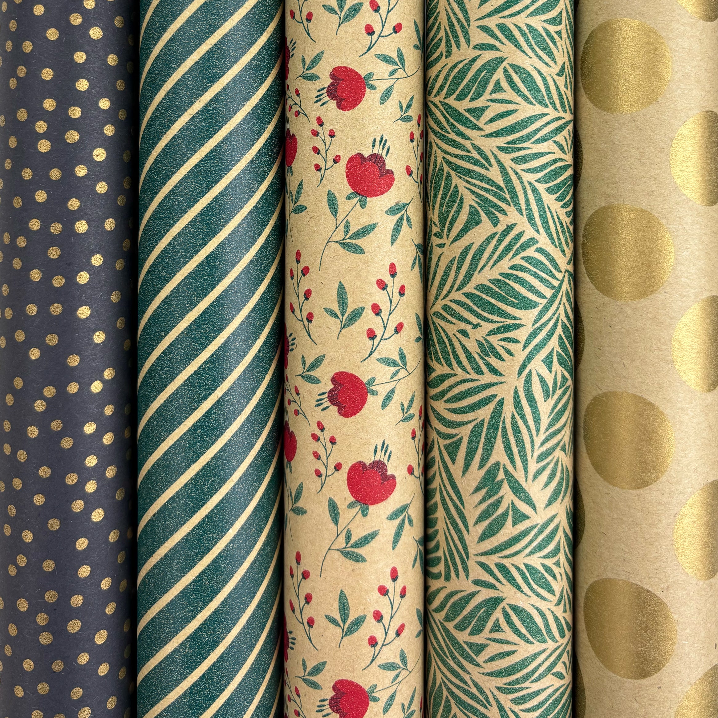 Verleihen Sie jedem Geschenk einen stilvollen und nachhaltigen Look mit diesem Set aus fünf Rollen Papier in Gras- und Kraftpapier-Optik. Die verspielten Muster in Grün-, Rot- und Goldtönen bieten für jeden Anlass das Richtige. Von Punkten und Streifen bis hin zu Blumen- und Blättermotiven ist für jeden Geschmack etwas dabei.