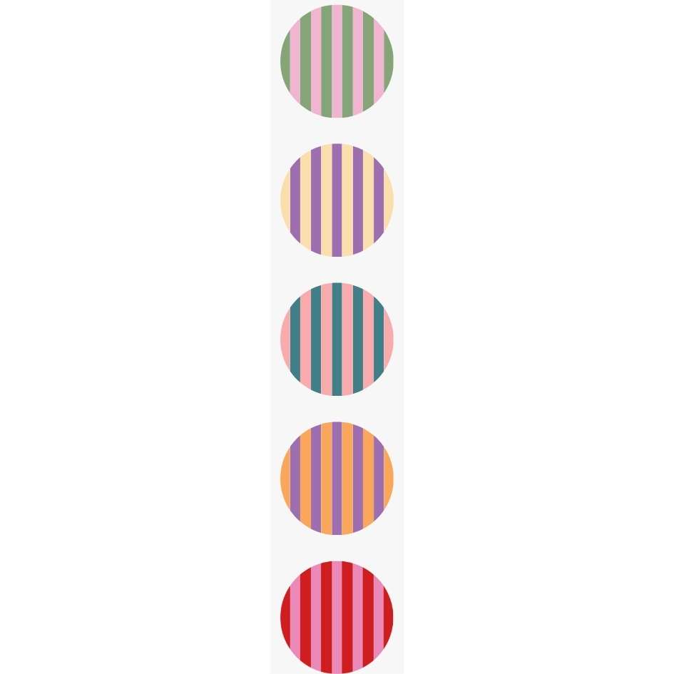 Breng kleur en speelsheid in elke toepassing met deze vrolijke stripes stickers! De set bevat 250 ronde etiketten (Ø 40 mm) met een modern streepdesign in diverse kleurcombinaties – perfect als sluitstickers, cadeaustickers of decoratie op schriften, traktaties, post en verpakkingen.